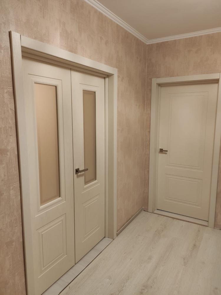 Щитовая конструкция с фрезеровкой. Отделка: эмаль по шпону ясеня RAL9001 Крем.